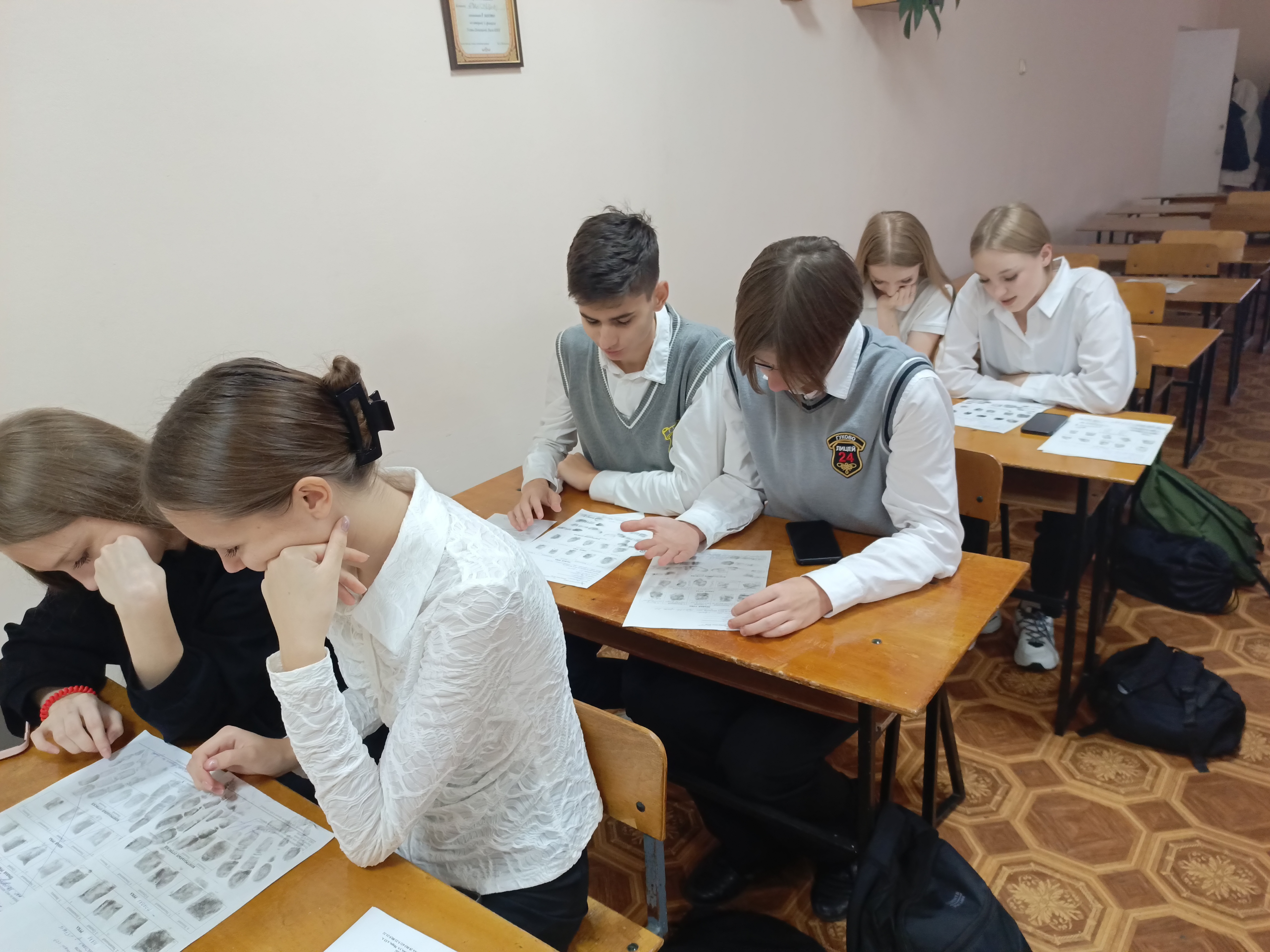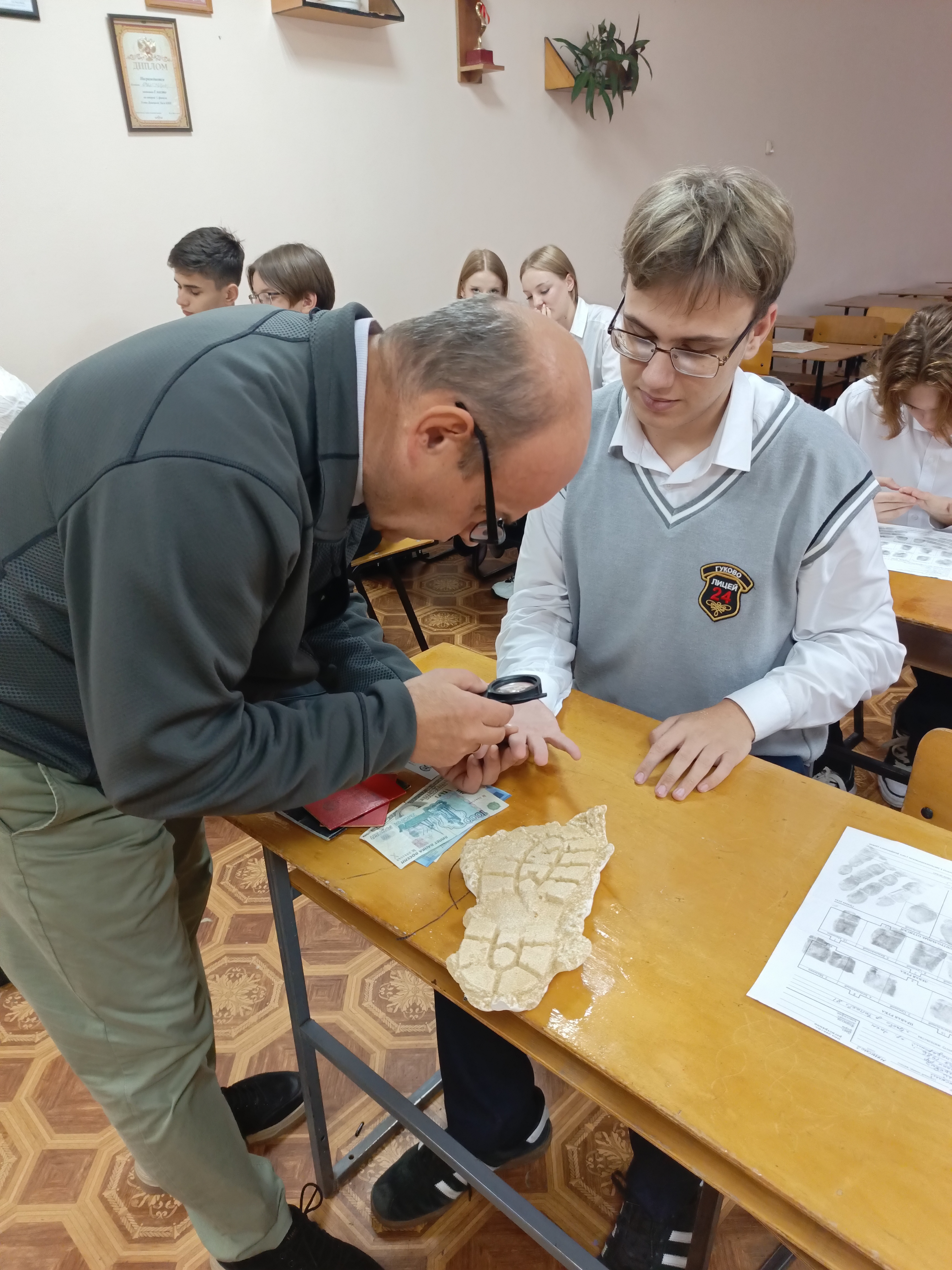 Преподаватель Сорокин В.В. провел со школьниками мастер-класс по современным методам исследования в области криминалистики, а именно подделка денежных знаков, исследование следов обуви, установление типов папиллярных узоров и выявление частоты встречаемости типов узоров.