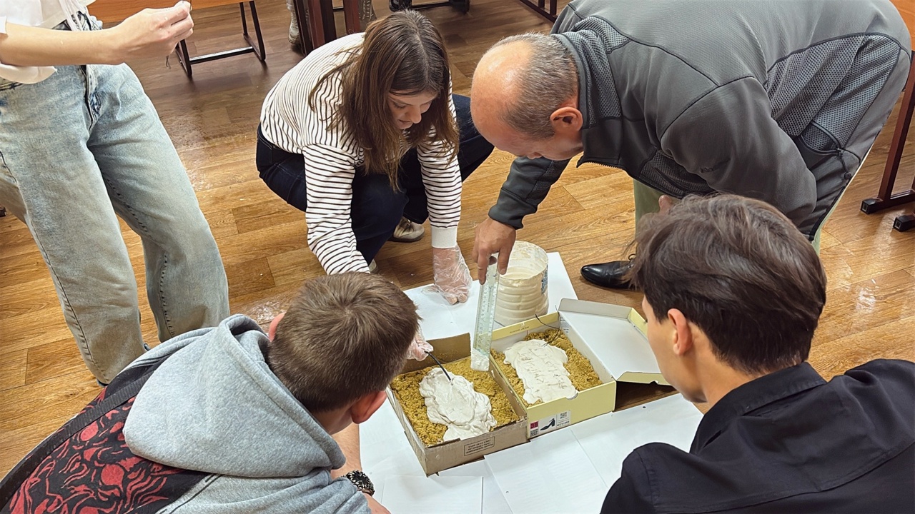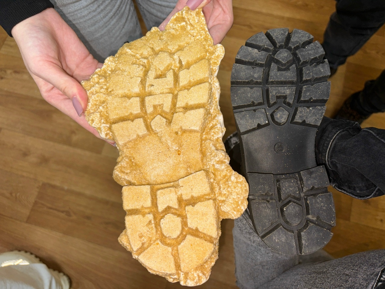 Очередное занятие по криминалистике в учебной группе ЮР-631 направление подготовки «Юриспруденция» было посвящено траксологическому исследованию следов обуви. Для занятия студенты приготовили необходимые материалы: песок, гипс, арматуру, бирки, нитки, разделились на две подгруппы и залили следы. А дальше было изучение рисунков следов и сравнительное исследование слепков с подошвой обуви.