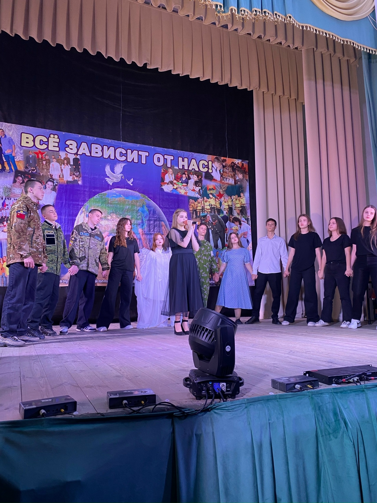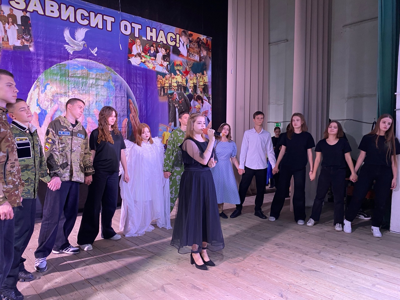 Творческий коллектив филиала представил театральную постановку «Вновь уходят ребята…», автором которой является Бакалова Арина, студентка 3 курса специальность «Право и организация социального обеспечения». Бакалова Арина, Винтилова Юлия, Атабаева Василиса. Выпряжкина Вероника, Светличная Анастасия, Муранова Евгения, Чепурная Валерия, Тендитный Иван, Захаров Иван, Кореньков Кирилл, Евсеенков Кирилл, Саврук Владислав, Саврук Кирилл представили выступление о подвиге и самоотверженности, солдатской дружбе, верности долгу и любви к Родине.